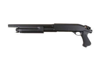 El uso de metal aumenta el peso del arma de airsoft, y la madera hace que sea más atractiva visualmente. Una solución eficaz también es cargar la imitación del shells con bolas de airsoft. De este modo, una vez disparadas todas las bolas, la "bola gastada" cae automáticamente de la cámara al soltar el bloqueo. Para aumentar la velocidad de las bolas disparadas, podemos, según el modelo, instalar un muelle más fuerte. Además, algunas de las escopetas de airsoft de muelle disponibles en nuestra tienda tienen más de un modo de disparo. En el modo básico Pump Action, disparamos un tiro después de recargar, y en el modo Slamfire, por ejemplo, disparamos automáticamente después de cada ciclo de recarga tras mantener apretado el gatillo. En las escopetas de airsoft se utilizan distintos tipos de cargadores de munición. Pueden ser, por ejemplo, shells con capacidad para 30 bolas, o un cargador de munición de caja con capacidad para 14 bolas.
