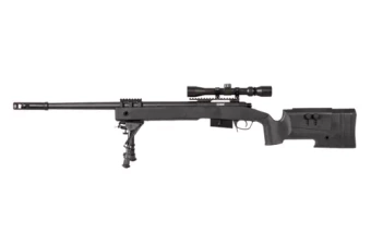 - 3 chargeurs inclus Version avec lunette et bipied Construction : métal + plastique Poids : 3755g Longueur : 1135 mm Couleur : noir Vitesse de sortie : ~420 Propulsion : à ressort Fabricant : Specna Arms